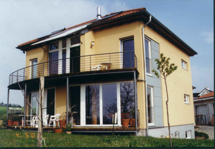 Gebäude mit kontrollierter Lüftungsanlage; Lüftungsgerät mit Erdwärmetauscher; Lüftung dient auch zur Kühlung im Sommer- eingeblasene Frischluft ist im Sommer um ca.:10 Grad C kühler als Außentemperatur; Energieverbrauch: weniger als 60 kWh pro Jahr u. m² Nutzfläche; mit einer Biomasseanlage wurde vom Freistaat Thüringen gefördert. |