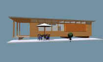Gebäude öffnet sich über den Wintergarten großflächig nach Süden u. Südwesten zur barrierefrei angrenzenden Holzterrasse und dem Garten;