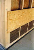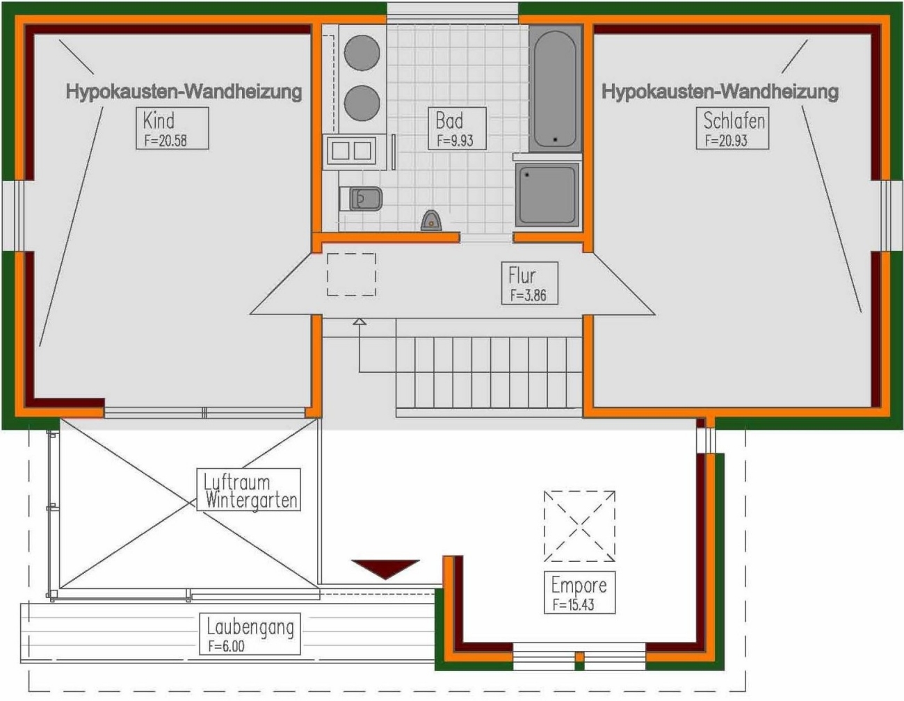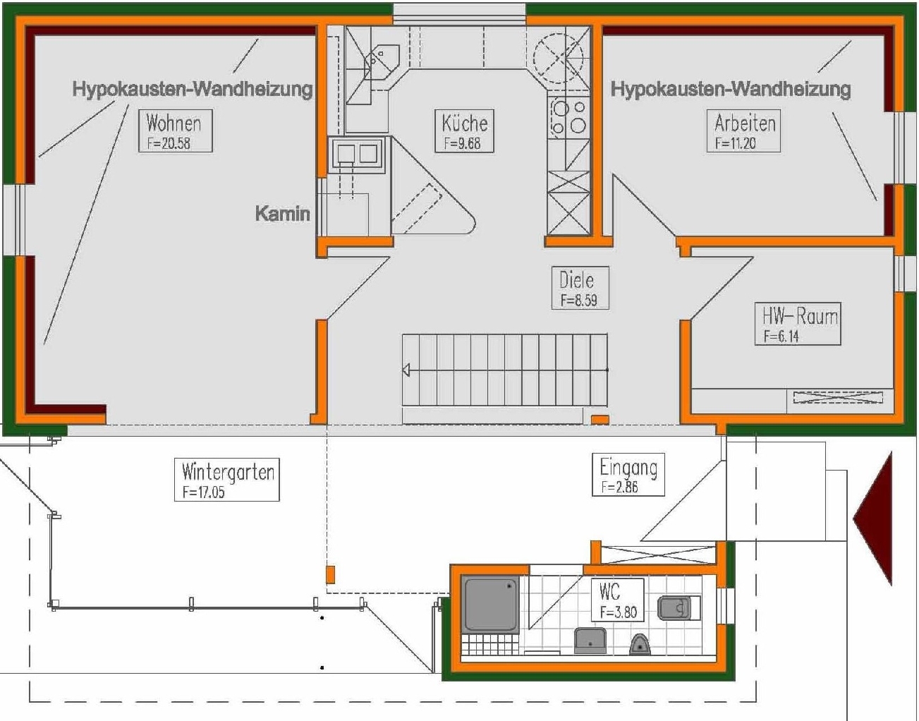 Innovative Hypokausten- Warmluft- Heizung Prinzip: 2 getrennte Luftschichten vor der Außenwand, die im Fußboden- und Deckenbereich miteinander verbunden sind; in raumseitig inneren Schicht verläuft Heizleiste mit Alu-Lammellen, aufströmende Warmluftluft erwärmt die raumseitige Gipskartonplatte. |