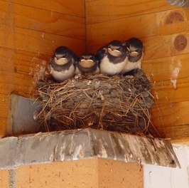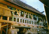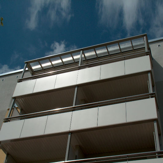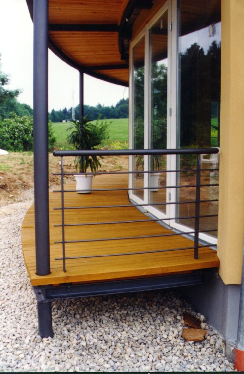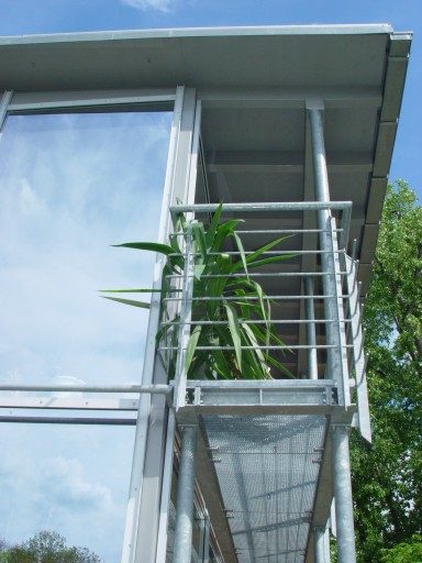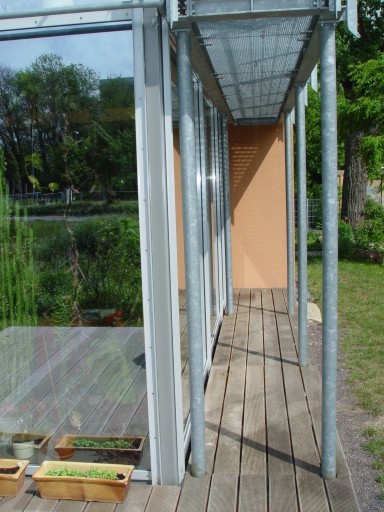 Laubengang als Zitat traditioneller regionaler Bauweise auf der Südseite = zusätzliche Verschattung, grenzt an einen breiten Schiebeflügel der Glasfassade, der die Empore zum überdachten Balkon werden lässt
