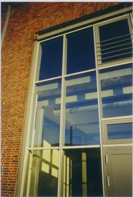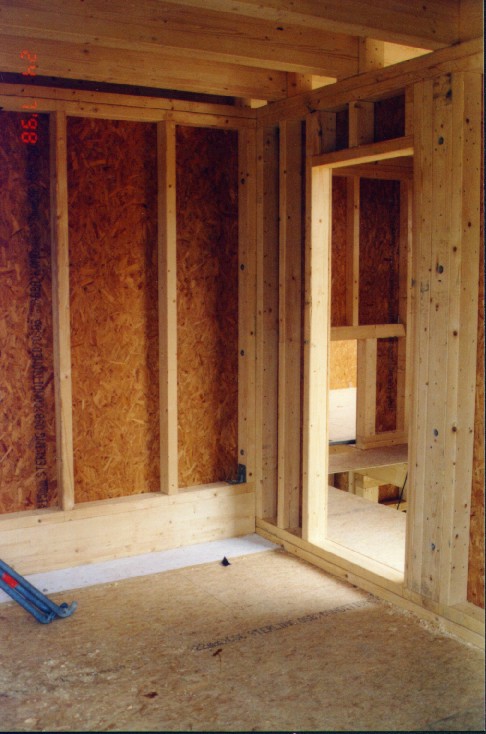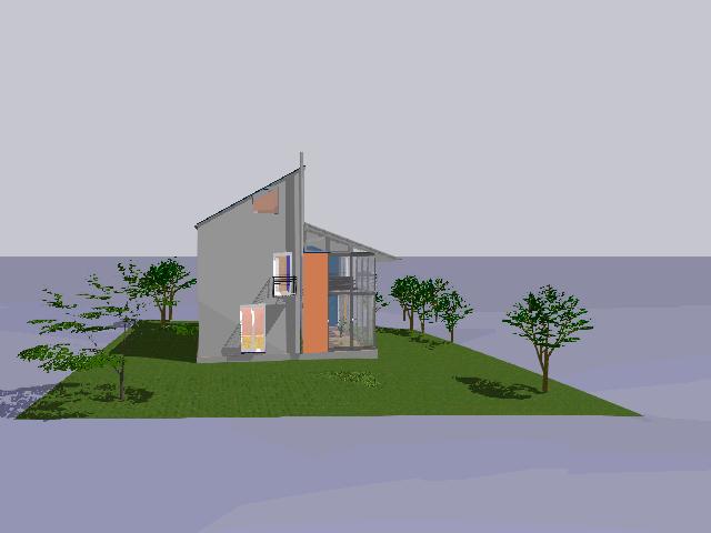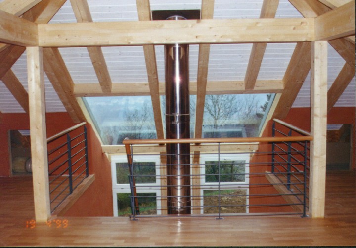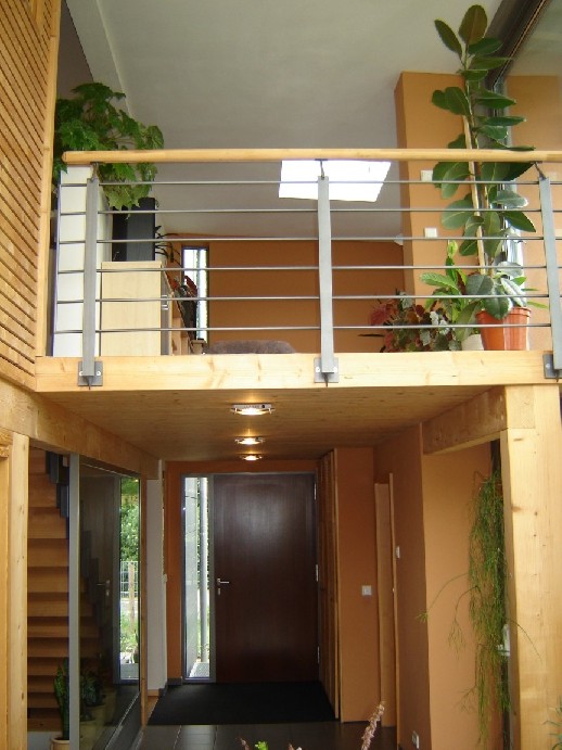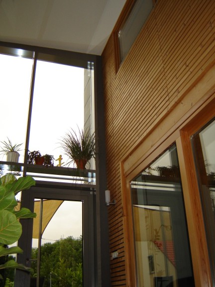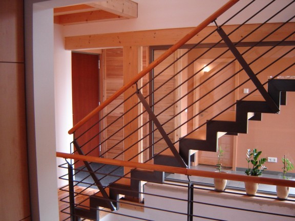 Gebäude als offener Raum über zwei Ebenen mit eingesetzten Raumstrukturen; Fenster (Dreifach- Verglasung) aus Lärchenholz mit äußerer Alu-Verkleidung |